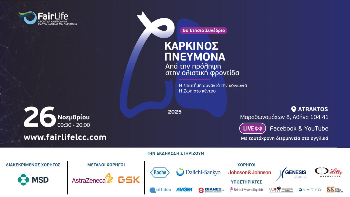 Η FairLife Φροντίδα και Πρόληψη για τον καρκίνο του πνεύμονα διοργανώνει το 5ο ετήσιο συνέδριο του φορέα με τίτλο «Καρκίνος Πνεύμονα – Από την Πρόληψη στην Ολιστική Φροντίδα – Η επιστήμη συναντά την κοινωνία – Η Ζωή στο κέντρο» με την ευγενική υποστήριξη των MSD, AstraZeneca και GSK, Roche, Daiichi Sankyo Greece, Johnson & Johnson, Genesis Pharma, ΦΑΡΜΑΣΕΡΒ-ΛΙΛΛΥ και υποστηρικτές τους Affidea, AMGEN, ΒΙΑΝΕΞ, BMS, ΙΣΤΟΔΙΕΡΕΥΝΗΤΙΚΗ, KARYO, Άγιος Λουκάς, Γενότυπος
