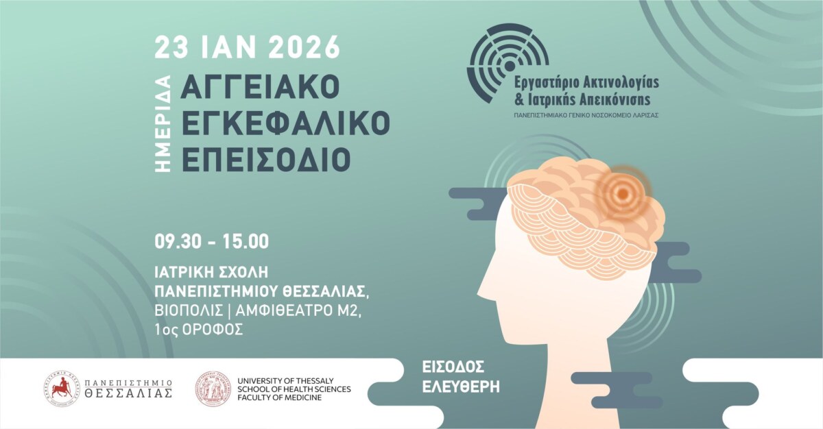 Το Εργαστήριο Ακτινολογίας και Ιατρικής Απεικόνισης του ΠΓΝ Λάρισας διοργανώνει ημερίδα με θέμα το Αγγειακό Εγκεφαλικό Επεισόδιο, την Παρασκευή 23 Ιανουαρίου 2026, στην Ιατρική Σχολή του Πανεπιστημίου Θεσσαλίας, Βιόπολις, Αμφιθέατρο Μ2.